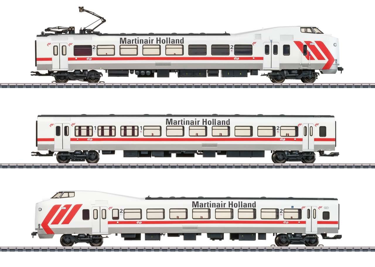 Vorbild: Dreiteiliger Elektro-Triebzug als Intercity Triebzug Baureihe ICM-1 ‘Koploper’ der Niederländischen Eisenbahnen (NS). Ausführung in der Gestaltung ‘Martinair Holland’. 1 Motorwagen als Endwagen mBk 2. Klasse, 1 Mittelwagen AB 1./2. Klasse, 1 Steuerwagen als Endwagen sBk 2. Klasse. Triebzug-Betriebsnummer 4012. Betriebszustand Juni 1986.