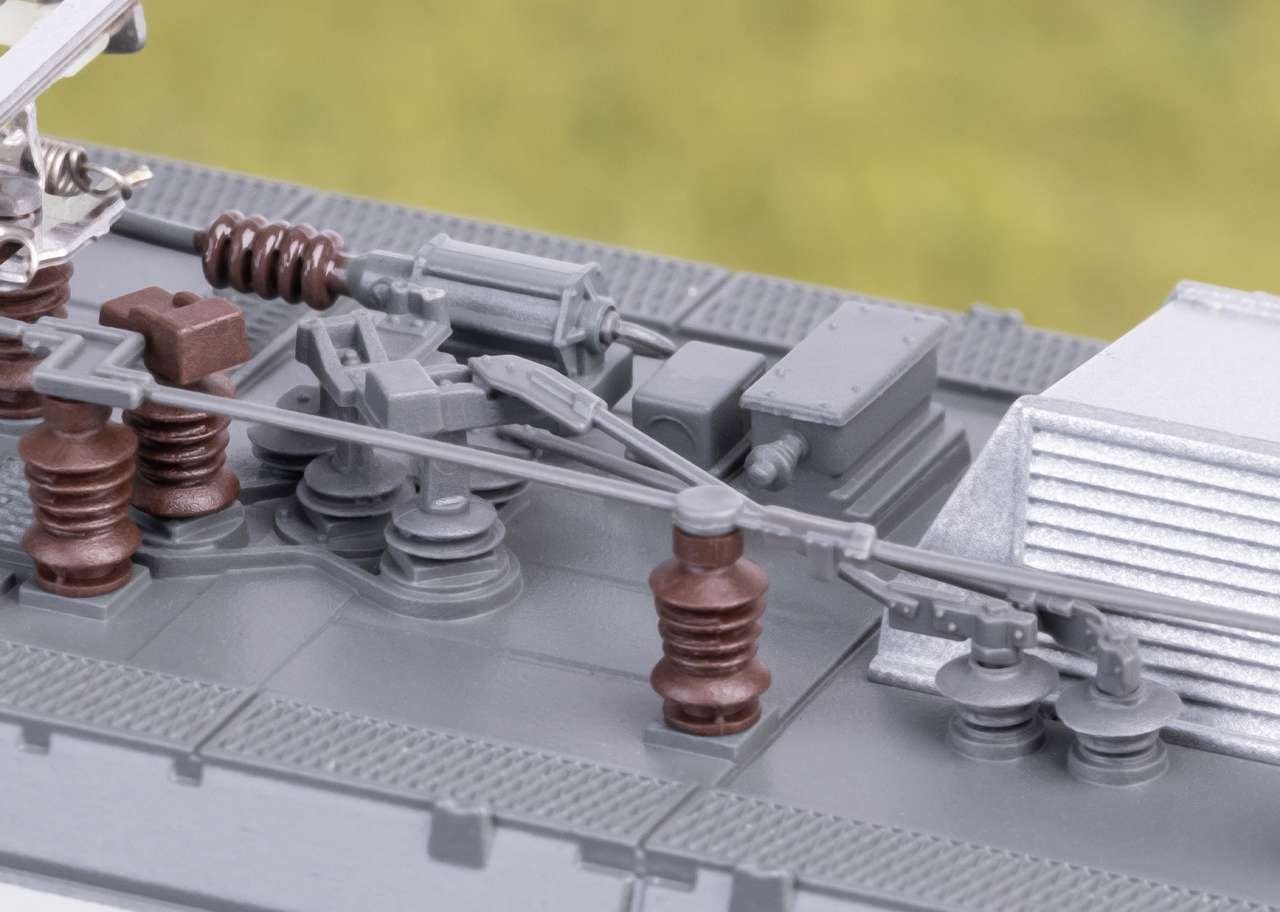 Mit Digital-Decoder mfx+ und umfangreichen Geräuschfunktionen. Geregelter Hochleistungsantrieb mit Schwungmasse zentral eingebaut. Alle vier Achsen über Kardan angetrieben. Haftreifen. Fahrtrichtungsabhängig wechselndes Dreilicht-Spitzensignal und zwei rote Schlusslichter konventionell in Betrieb, digital schaltbar. Spitzensignal an Lokseite 2 und 1 jeweils digital separat abschaltbar. Doppel-A-Licht-Funktion. Führerstandsbeleuchtung digital schaltbar. Beleuchtung mit wartungsfreien warmweißen und roten Leuchtdioden (LED). Mit Pufferspeicher. Viele separat angesetzte Teile wie Scheibenwischer, Lüftergitter, Griffstangen und Dachleitungen. Detailliert ausgeführte Dachaufbauten mit neu konstruierten Stromabnehmern mit unterschiedlichen Schleifstücken. Pufferhöhe nach NEM. Bremsleitungen, Schraubenkupplungen und unterschiedliche Steckdosen liegen als separat ansteckbare Teile bei. Länge über Puffer 20,3 cm.