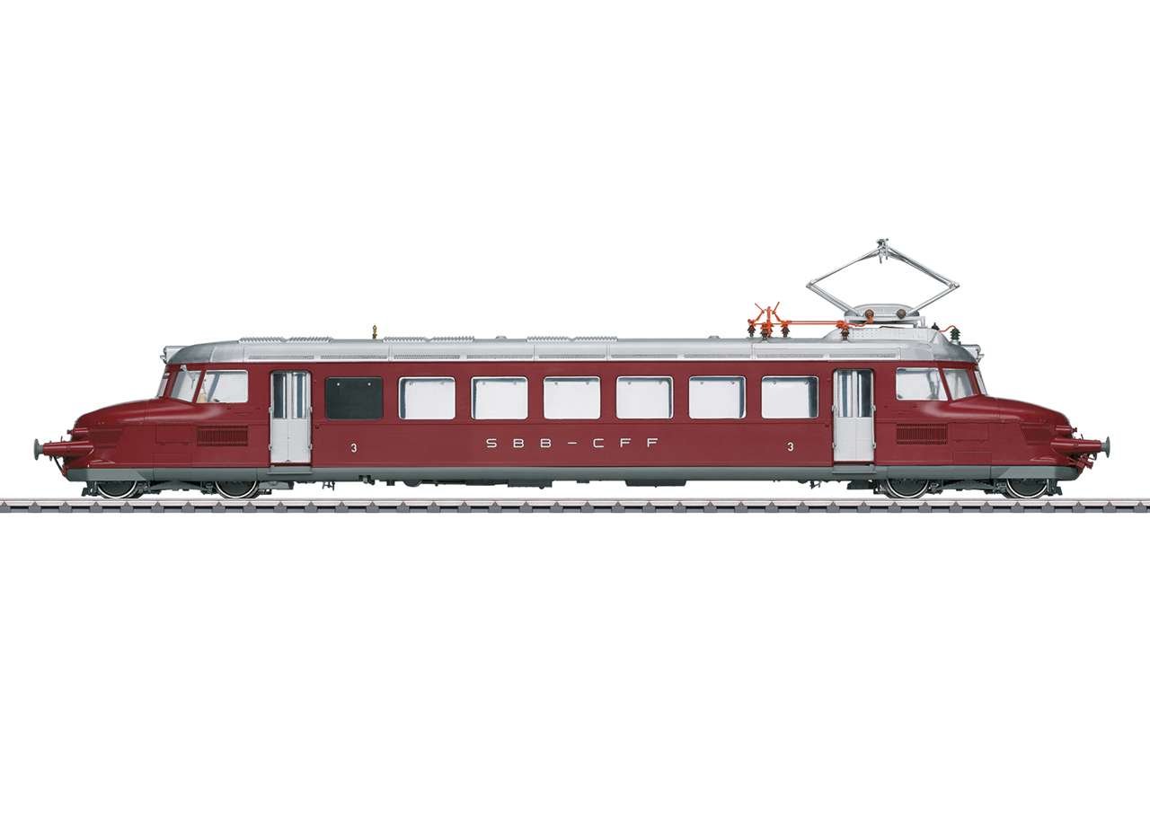 Vorbild: Elektrischer Schnelltriebwagen Serie RCe 2/4 ‘Roter Pfeil’, 3. Klasse, als Museumsfahrzeug für Extrafahrten unterhalten durch die Oensingen-Balsthal-Bahn AG (OeBB). Aufgearbeitet gibt der Triebwagen äußerlich den Zustand Mitte der 1950er Jahre in purpurroter Grundfarbgebung der SBB wieder. Triebwagen-Betriebsnummer 607. Betriebszustand 2023.