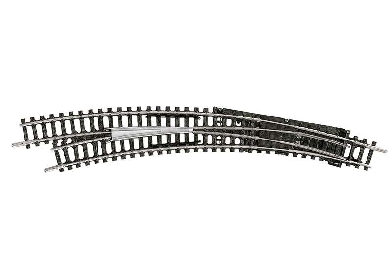 Bogenweiche R3/R4 links mit polarisiertem Herzstück.Die Bogenweiche R3/R4 ist unter den gleichen Gesichtspunkten wie die Bogenweiche R1/R2 entwickelt worden, nur dass sie eben auf die Radien R3 und R4 abgestimmt ist und dass ein Bogenwinkel von 30° in Rechnung gesetzt werden kann.Die Gleisführung ist also wesentlich schlanker. Trotzdem ist jedoch der Platzbedarf auch für kleinere Anlagen noch nicht zu groß.