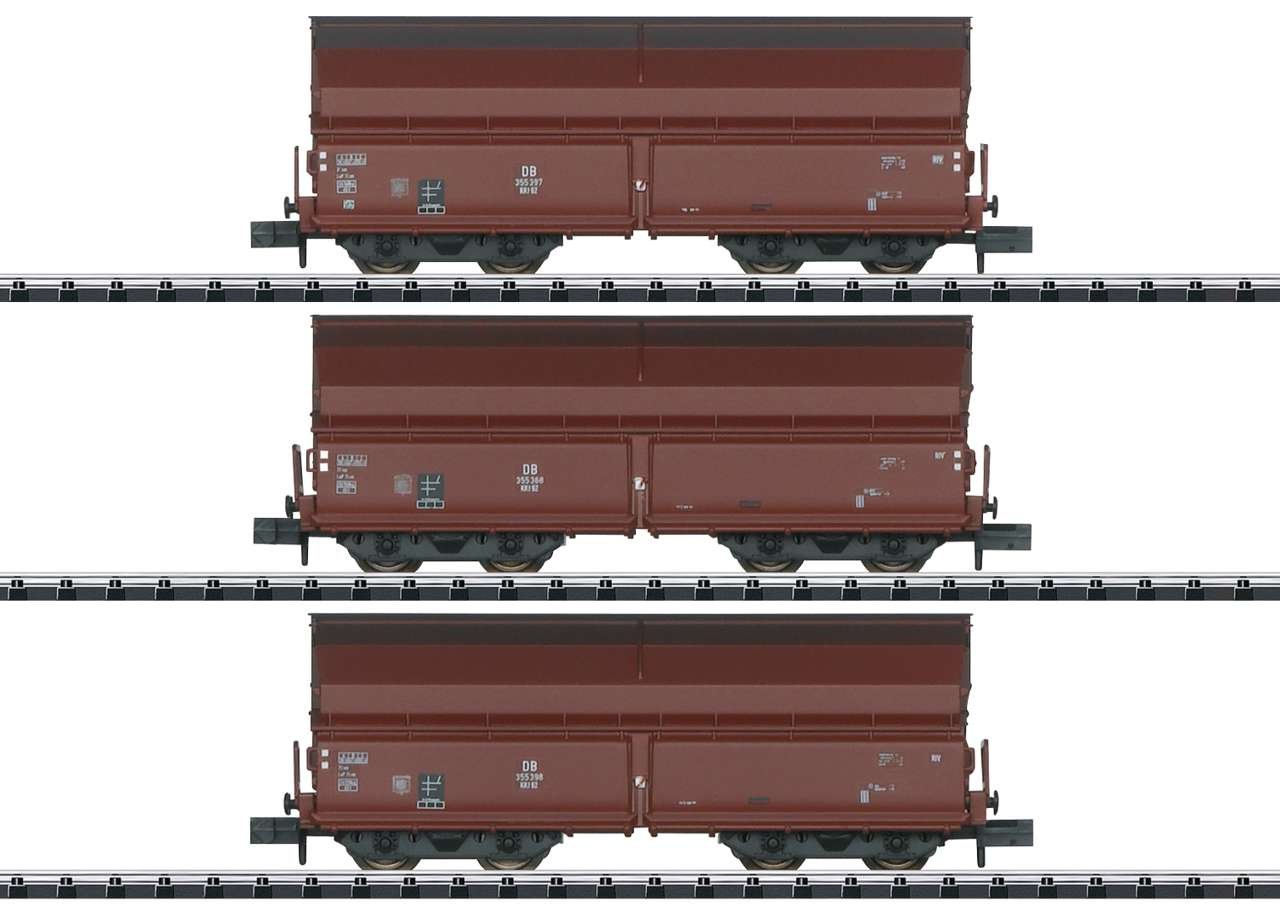 Modell: Selbstentladewagen in detaillierter Ausführung mit unterschiedlichen Betriebsnummern. Alle Wagen mit Bremserbühne und stirnseitigem Stellrad. Alle Wagen mit Kinematik für Kurzkupplung. Gesamtlänge über Puffer 213 mm.