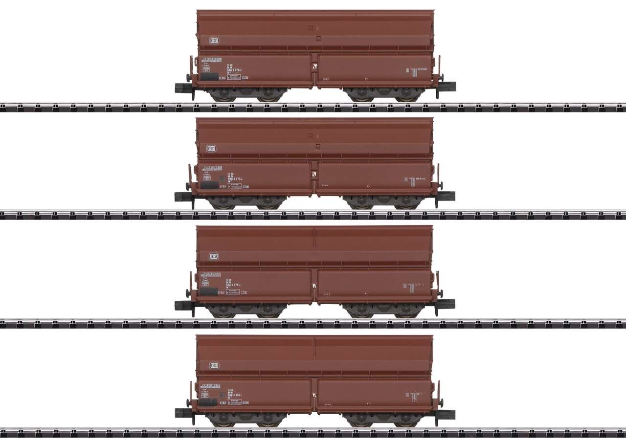 Modell: Neukonstruktion. Selbstentladewagen in detaillierter Ausführung mit unterschiedlichen Betriebsnummern. Alle Wagen mit Bremserbühne und stirnseitigem Stellrad. Alle Wagen mit Kinematik für Kurzkupplung. Ein Wagen mit bedruckten Zugschlussscheiben an einem Wagenende. Gesamtlänge über Puffer 284 mm.