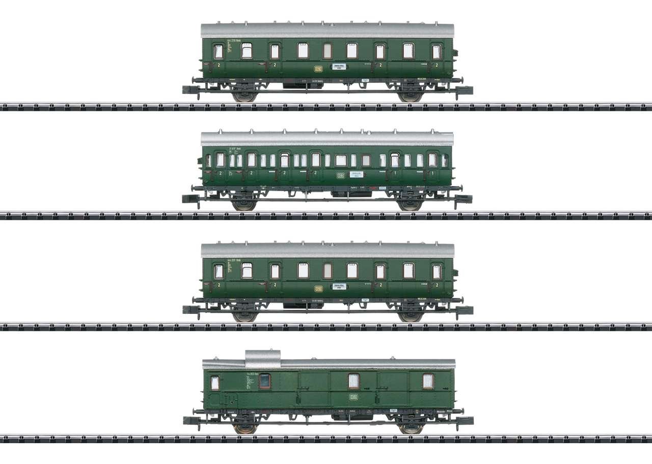 Vorbild: 1 Einheits-Abteilwagen 1./2. Klasse AB-21, 2 Einheits-Abteilwagen 2. Klasse Bd-21b, 1 Gepäckwagen Pwi-23 im Zustand um 1960 der Deutschen Bundesbahn (DB).