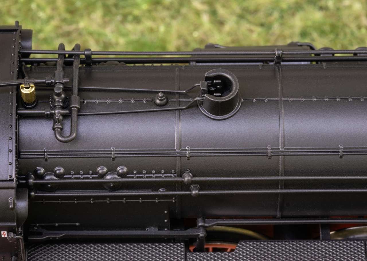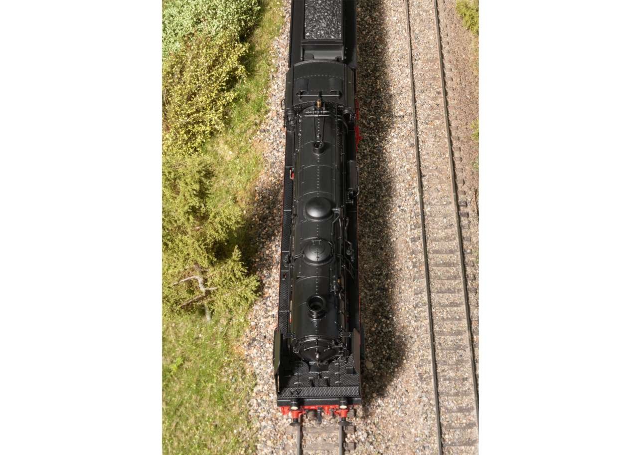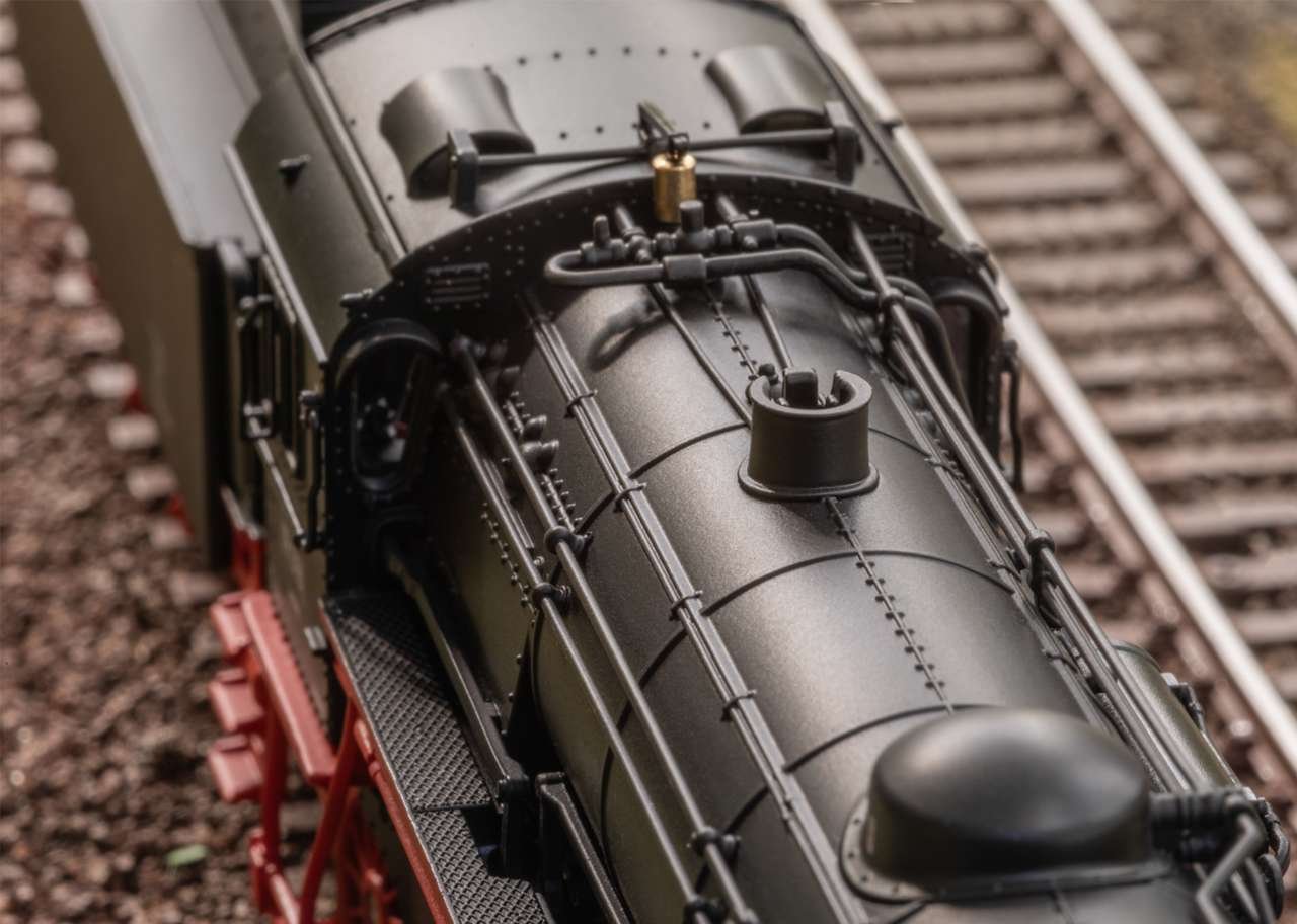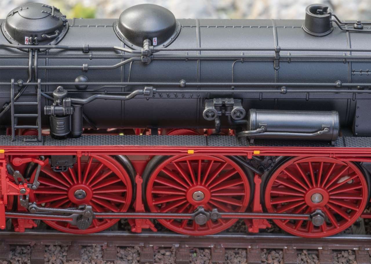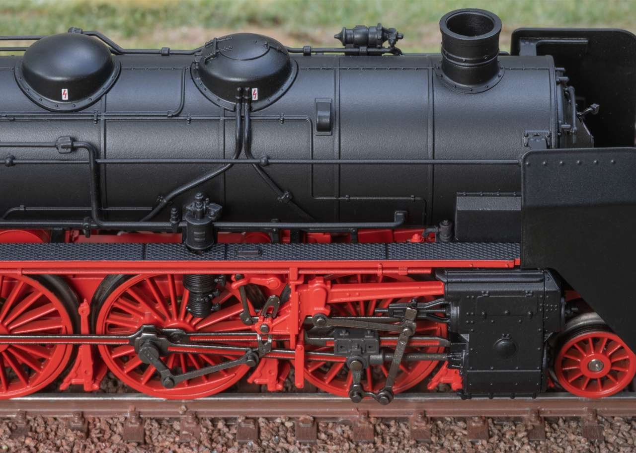 Mit Digital-Decoder und umfangreichen Geräuschfunktionen. Geregelter Hochleistungsantrieb mit Schwungmasse im Kessel. 4 Achsen angetrieben. Haftreifen. Lokomotive und Tender weitgehend aus Metall. Serienmäßig eingebauter Raucheinsatz, mit geschwindigkeitsabhängigem, dynamischem Rauchausstoß. Fahrtrichtungsabhängig wechselndes Zweilicht-Spitzensignal konventionell in Betrieb, digital schaltbar. Führerstandbeleuchtung und Feuerbüchsenflackern jeweils separat digital schaltbar. Beleuchtung mit wartungsfreien warmweißen und roten Leuchtdioden (LED). Mit Pufferspeicher. Schwenkbare Führerstandtüren und Imitation der Vorhänge zwischen Führerstand und Tender. Kurzkupplung mit Kinematik zwischen Lok und Tender. Am Tender kinematikgeführte Kurzkupplung mit NEM-Schacht. Pufferhöhe an Lok und Tender nach NEM. Befahrbarer Mindestradius R2 437,5 mm. Kolbenstangenschutzrohre und Bremsschläuche liegen bei. Länge über Puffer 26,0 cm.