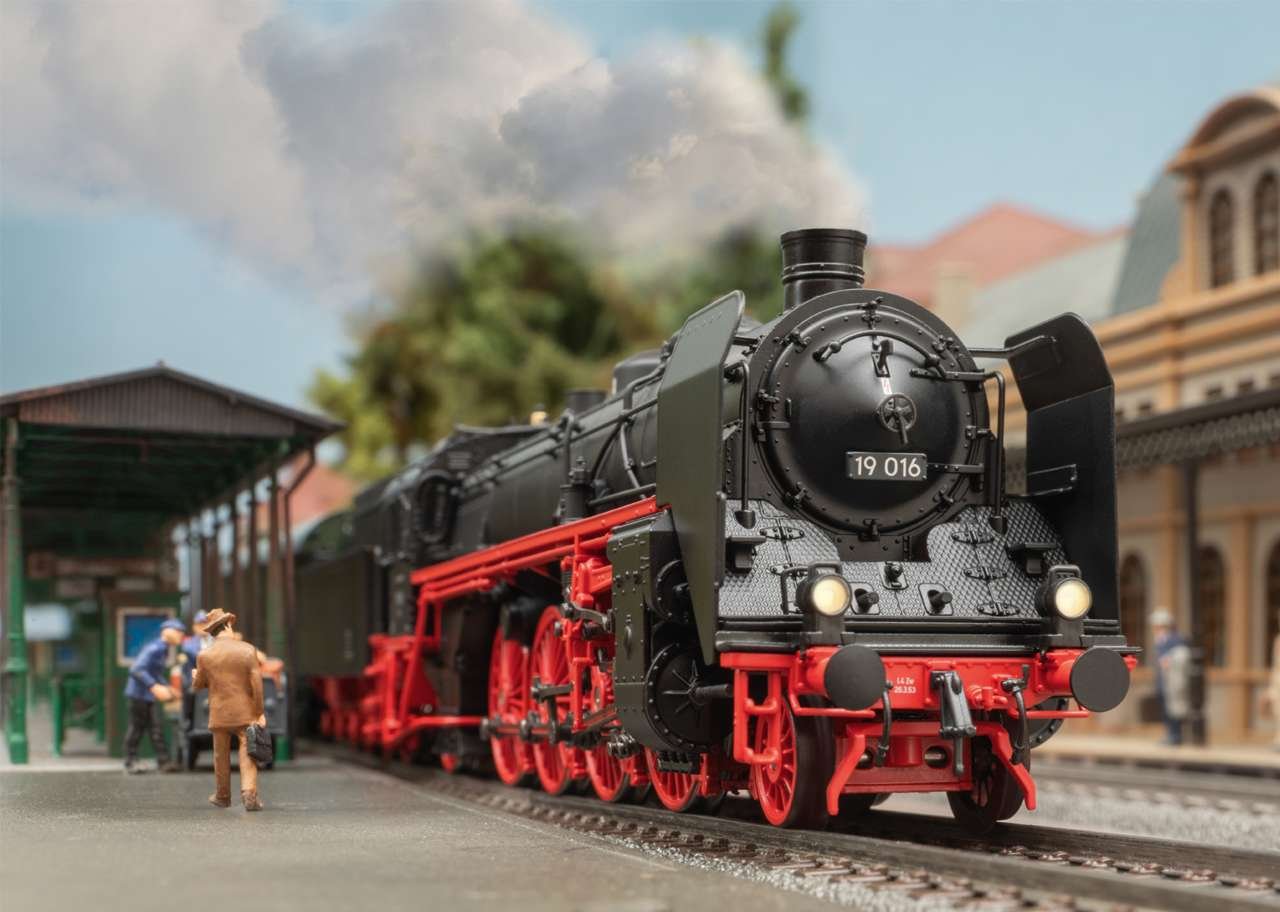 Vorbild: Schnellzug-Dampflokomotive Baureihe 19.0 ‘Sachsenstolz’ (Sächsische Gattung XX HV), mit sächsischem Kohlen-Schlepptender 2´2 T31. Deutsche Reichsbahn der DDR (DR/DDR). Mit großen Windleitblechen. Lok-Betriebsnummer 19 016. Betriebszustand Epoche IIIa, Anfang der 1950er Jahre.