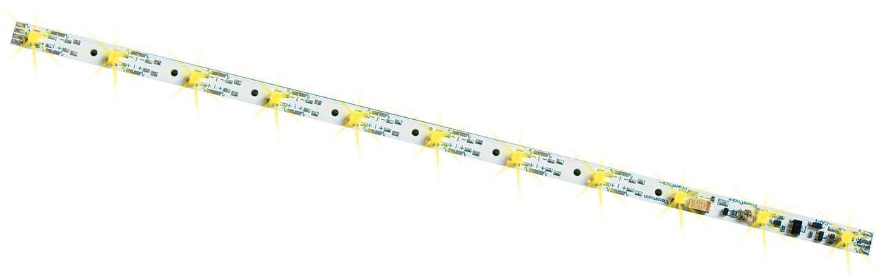 Vielfach kürzbare Innenbeleuchtung mit 11 wartungsfreien, stromsparenden LEDs und hellem Licht. Helligkeit durch Potentiometer einstellbar. Geeignet für Waggons aller Hersteller, die für Beleuchtung vorgesehen sind. Befestigung der Platinen unter dem Waggondach. Durch Kürzen können die Platinen auf jede Waggonlänge angepasst werden. Flackerschutz und Konstantstromquelle für gleichbleibend helles Licht integriert. Die Stromversorgung erfolgt entweder durch am Waggon vorhandene Schleifer/Kontaktsätze oder durch unsere stromführenden Kupplungen Art. 5048/5071. Für Gleich-, Wechsel- und Digitalstrom geeignet. Anschlussmöglichkeit für Zugschlussbeleuchtung, z. B. Art. 5056. Stromaufnahme ca. 38 mA. Maße: L 25,4 x B 0,7 cm.