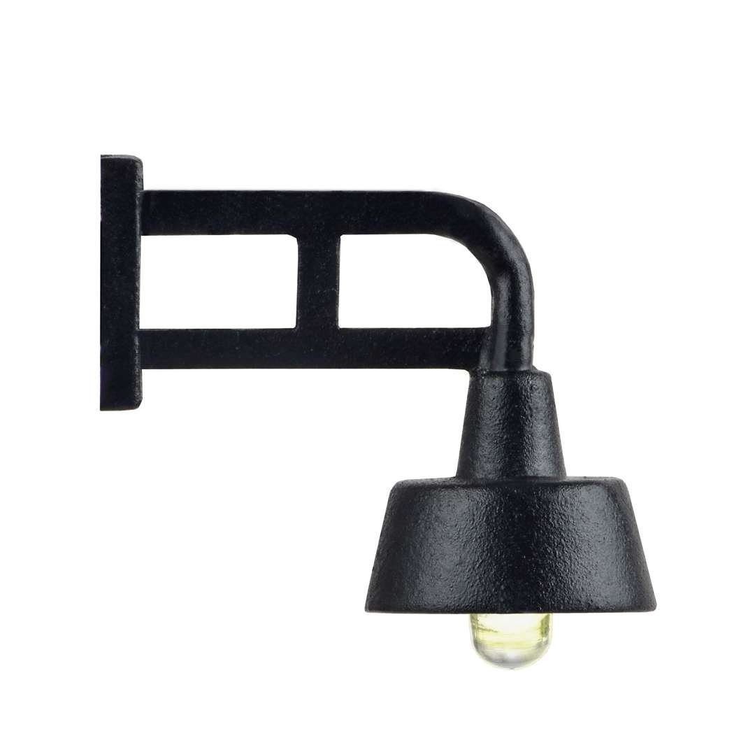 Diese einfache Wandlaterne eignet sich hervorragend für Lagergebäude, Schuppen und Bahnbetriebswerke der Epoche III. Wartungsfrei dank LED-Beleuchtung.